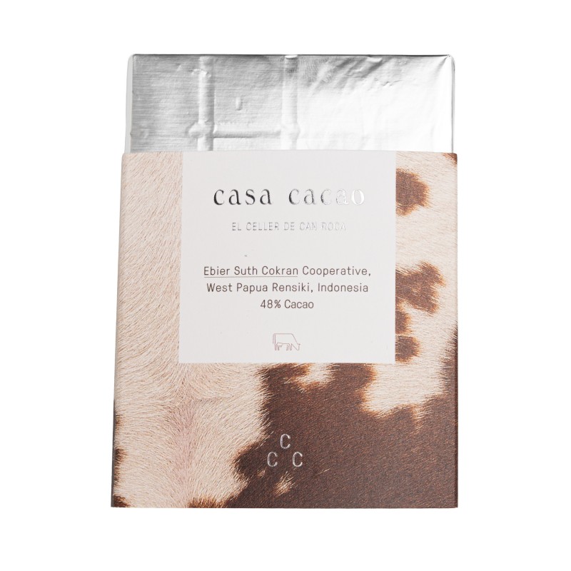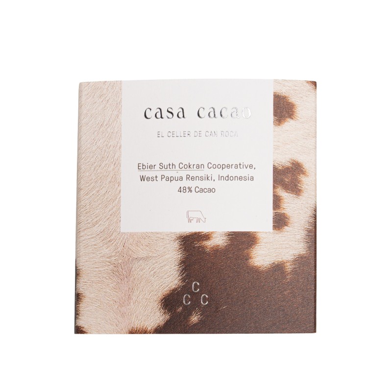 Cacau procedent de West Papua, Indonèsia. Elaborat amb faves de cacau seleccionades, sucre, llet en pols desnatada, mantega de cacau i mantega concentrada.