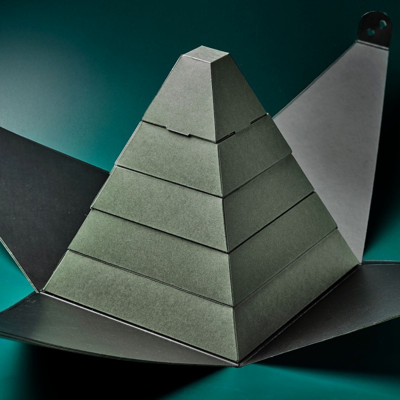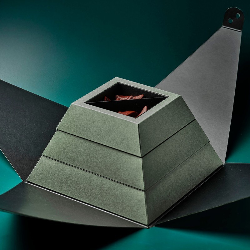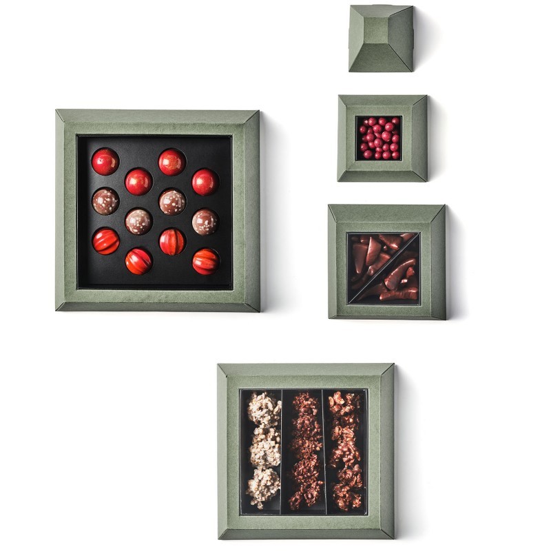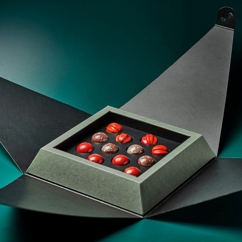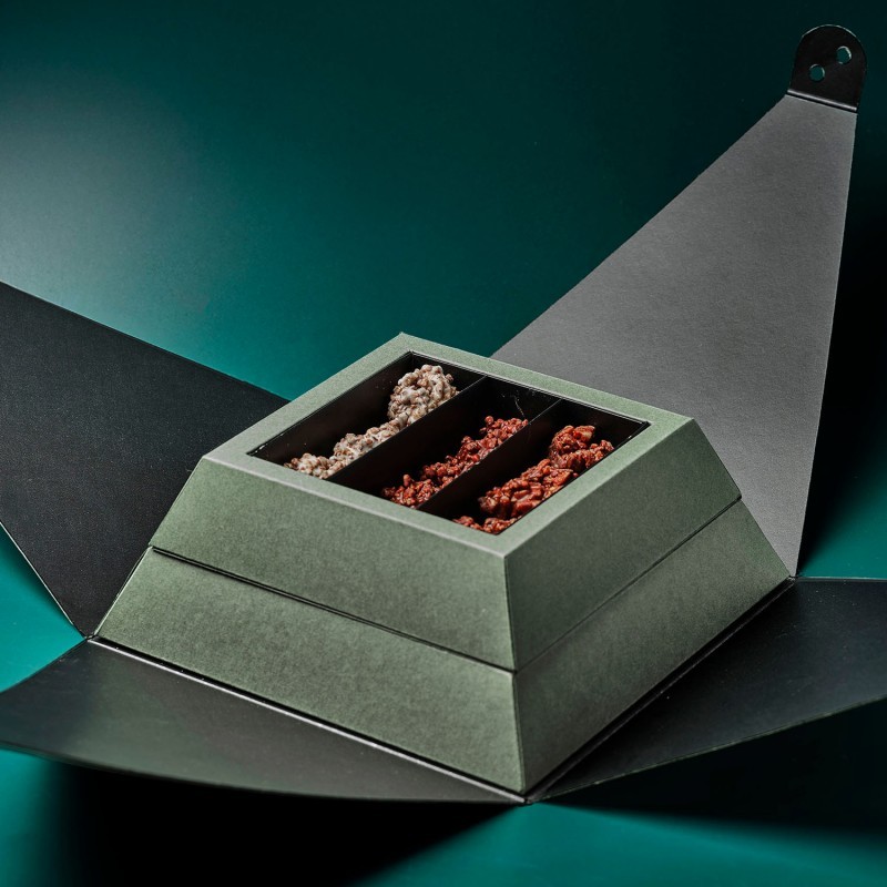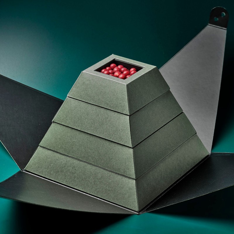 Una propuesta original en forma de pirámide que esconde en su interior una variada selección de chocolates y bombones. En su interior encontrarás: