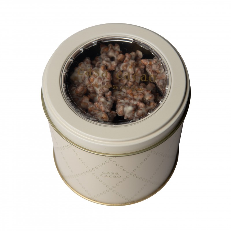 Mezcla de chocolate blanco con pistachos caramelizados y fruta confitada de arándano.