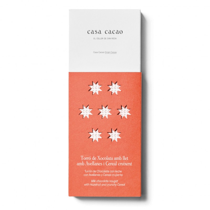 Nougat au chocolat au lait avec des noisettes et des céréales croustillantes, avec un minimum de 62 % de cacao. Élaboré artisanalement dans notre atelier Bean to Bar.