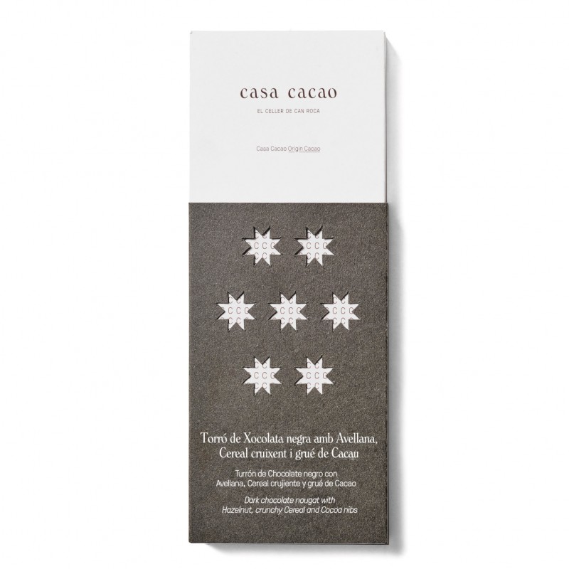 Nougat au chocolat noir avec des noisettes, des céréales croustillantes et des fèves de cacao concassées, avec un minimum de 61 % de cacao. Élaboré artisanalement dans notre atelier Bean to Bar.