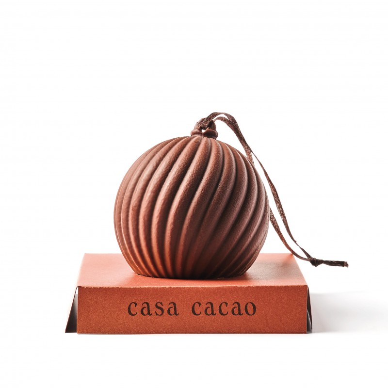 Sphère de Noël réalisée en chocolat au lait et gianduja aux amandes.