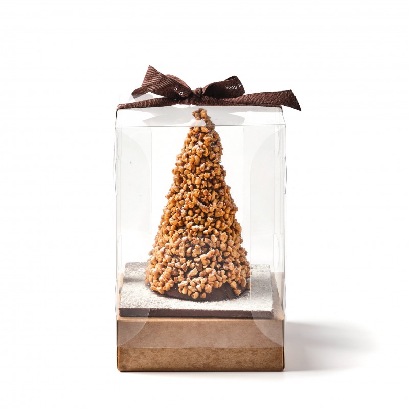 Figure en forme de sapin de Noël réalisée en chocolat noir et noix de pécan concassées.